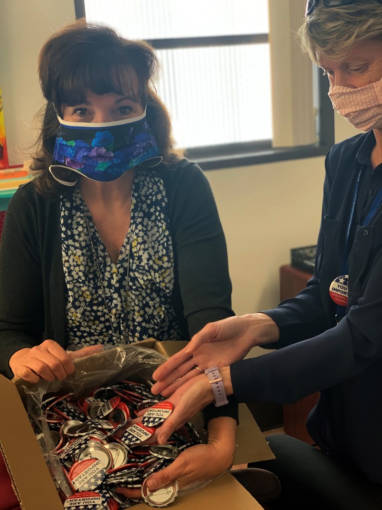 So Connell searched for another pin maker and found one in Arizona called “Everyone Loves Buttons.” Because the company contracts with government agencies, it is considered an essential business and remains open. Connell found a kindred spirit in company president Maura Statman.