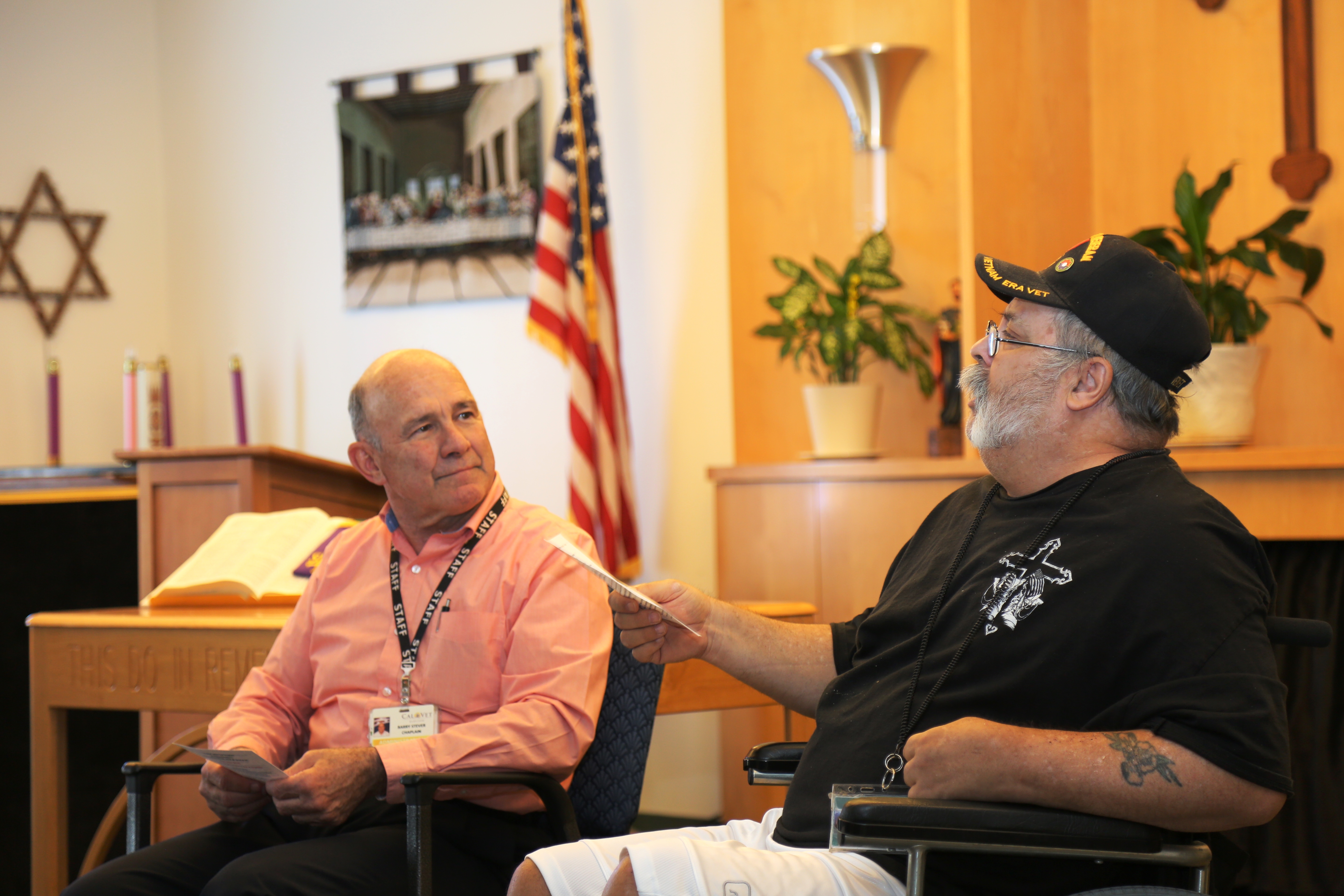 - Tony Rambonga Jr., a member of the Vietnam Veterans of America Chapter 223, hands an American flag to Butch Frederickson, a member of the Vietnam Veterans of America Chapter 582, outside a south Chico home on Monday. (Risa Johnson — Enterprise-Record)