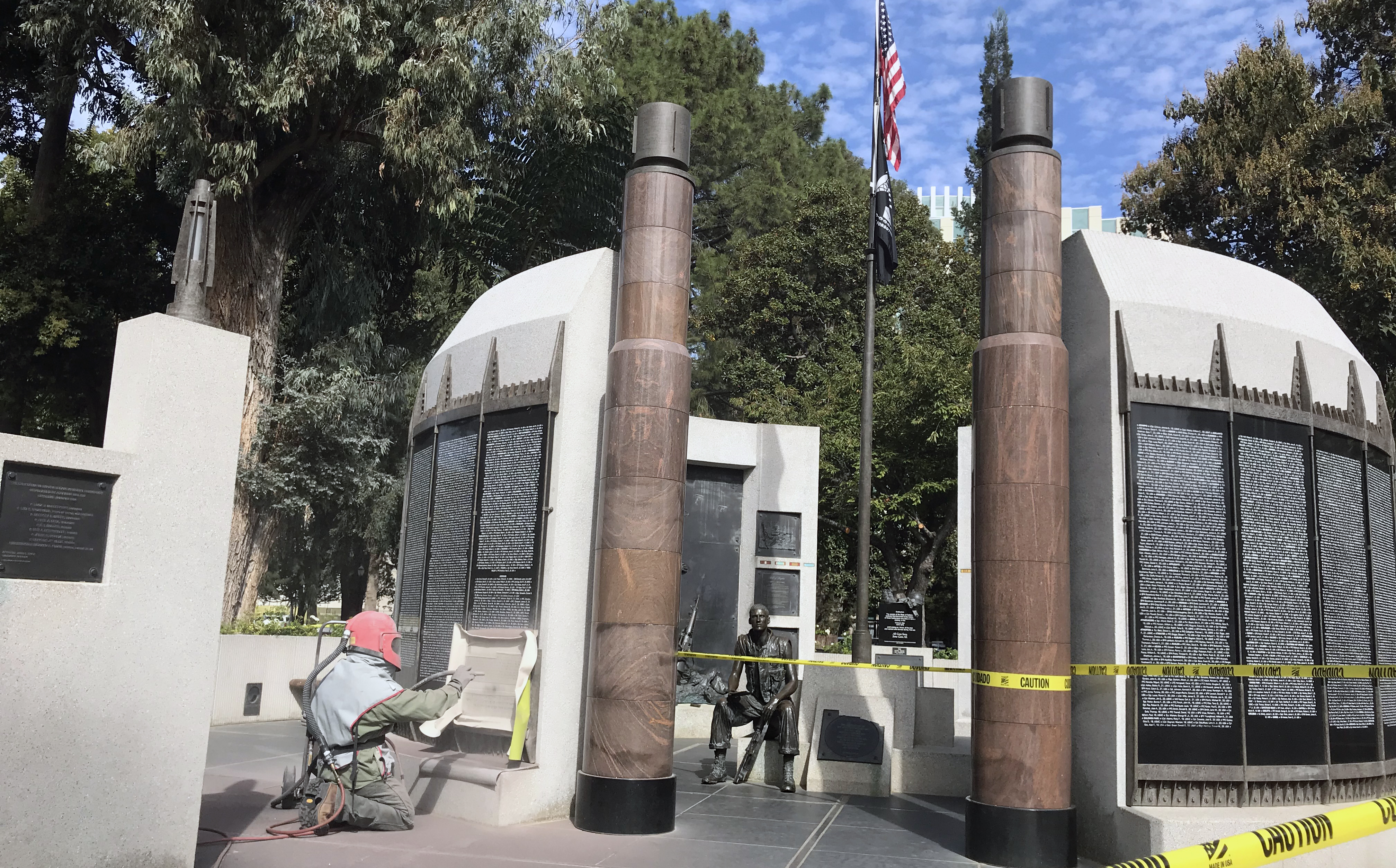 - Mural artist Carlos Aguilar uses a brush to temporarily paint over graffiti that was sprayed on his outdoor mural in Santa Ana depicting nearly 200 Mexican-American veterans on March 20, 2018. He hopes that funds can be raised to help pay for the damage to his mural that is on the side of the La Chiquita Market at the corner of E. Washington Avenue and N. Custer Street in Santa Ana, (Photo by Mark Rightmire, Orange County Register/SCNG)