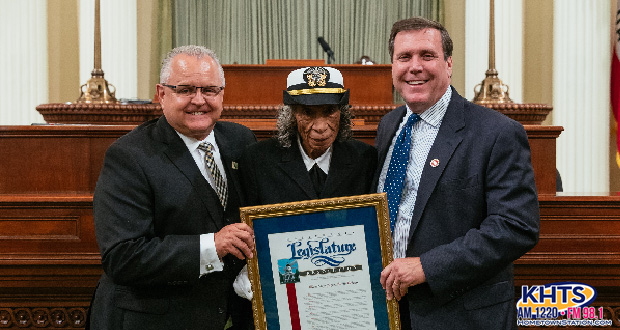 - Chumash tribe descendants Stanley Leighton, left, and Shadowdancer Melendez, center with Ventura Veterans Home Administrator Julian Bond. Photo by Timothe Alaniz.